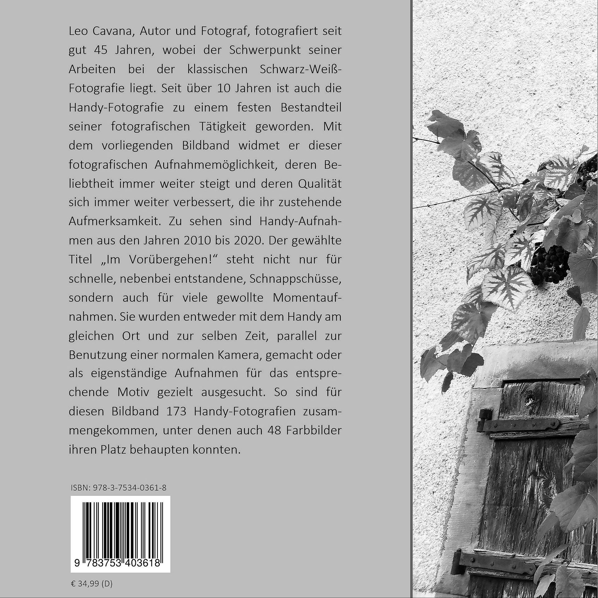 Als Fotograf ist Leo Cavana jetzt schon seit gut 45 Jahren, meistens mit dem Schwerpunkt klassische Schwarz-Weiß-Fotografie, unterwegs. Seit über 10 Jahren ist auch bei ihm die Handy-Fotografie zu einem festen Bestandteil seiner fotografischen Tätigkeit geworden. Mit dem vorliegenden Bildband widmet er dieser fotografischen Aufnahmemög-lichkeit, deren Beliebtheit immer weiter steigt und deren Qualität sich immer weiter verbessert, die ihr zustehende Aufmerksamkeit. Zu sehen sind Handy-Aufnahmen aus den Jahren 2010 bis 2020. Der gewählte Titel - Im Vorübergehen! - steht nicht nur für schnelle, nebenbei entstandene, Schnapp-schüsse, sondern auch für viele gewollte Moment-aufnahmen. Sie wurden entweder mit dem Handy am gleichen Ort und zur selben Zeit, parallel zur Benutzung einer normalen Kamera, gemacht oder als eigenständige Aufnahmen für das entsprechende Motiv gezielt ausgesucht. So sind für diesen Bildband 173 Handy-Fotografien zusammengekommen, unter denen auch 48 Farbbilder ihren Platz behaupten konnten.